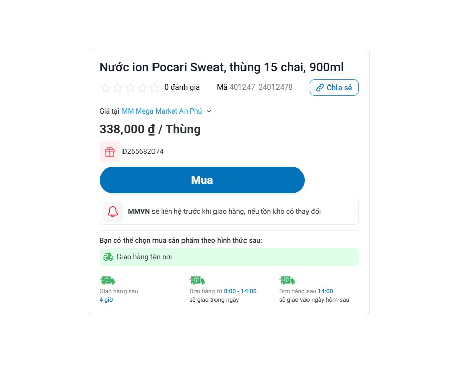 Theo thông tin tham khảo từ hệ thống bán hàng trực tuyến của MM Mega Market, sản phẩm: